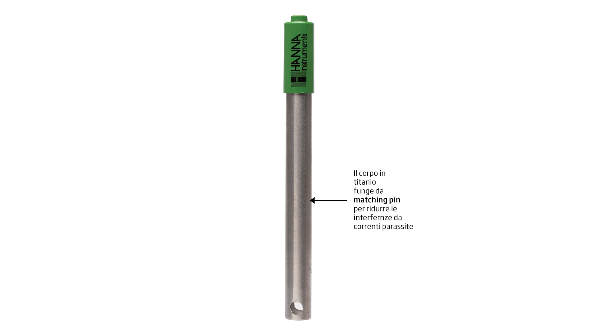 Il corpo in titanio funge anche da matching pin. È una tecnica di misura differenziale utilizzata per eliminare potenziali interferenti, esterni a quello di misura legato agli ioni idrogeno. Il matching pin raccoglie questi campi magnetici variando il potenziale di riferimento e aggiustandolo continuamente rispetto ai potenziali parassiti. Questa tecnologia permette perciò di garantire misure di pH stabili e sempre affidabili. Viceversa, in un sistema senza matching pin, le correnti elettriche nel campione possono influenzare il potenziale costante della semicella di riferimento portando a misure di pH errate.