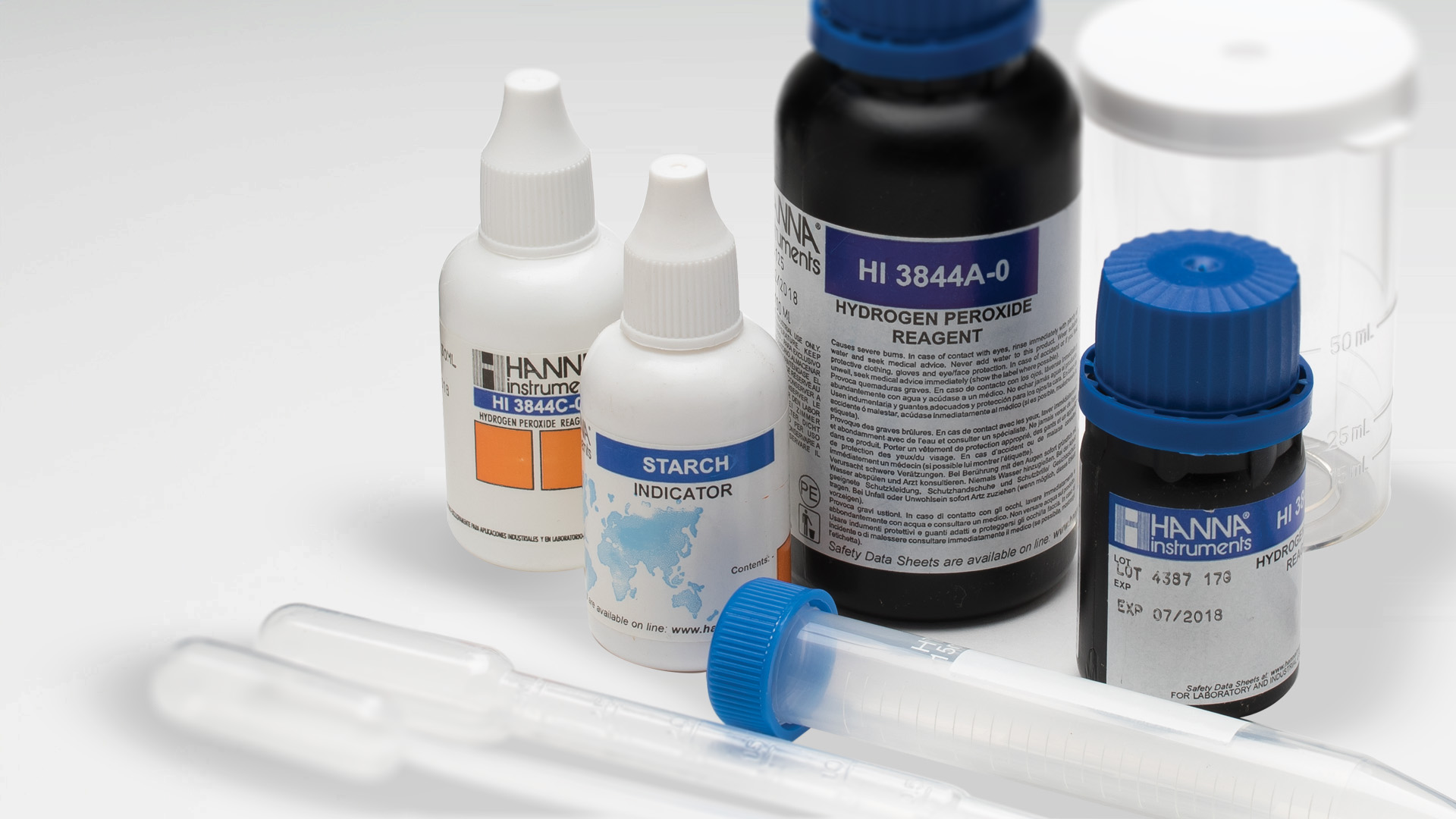 I test kit Hanna vengono forniti pronti all'uso, completi di tutti gli accessori necessari. Sono progettati per aiutarti a lavorare al meglio, in modo sicuro e rapido. Tutti i kit Hanna utilizzano flaconi contagocce, identificati in maniera chiara e inequivocabile. Con alcuni kit, viene fornito un beaker (o becher) con un tappo per evitare fuoriuscite e sprechi. Ogni kit è realizzato secondo i più elevati standard di qualità e per ogni reagente è disponibile online la scheda di sicurezza (SDS).