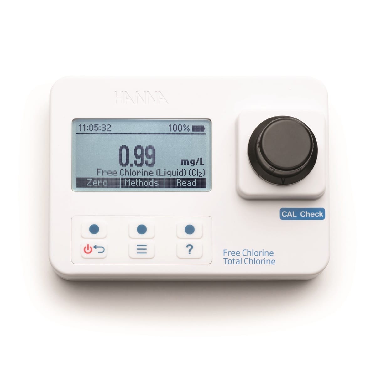 Reagenti e metodo: HI97711 consente di misurare il cloro libero e totale da 0.00 a 5.00 mg/l, con risoluzione 0.01 mg/l.