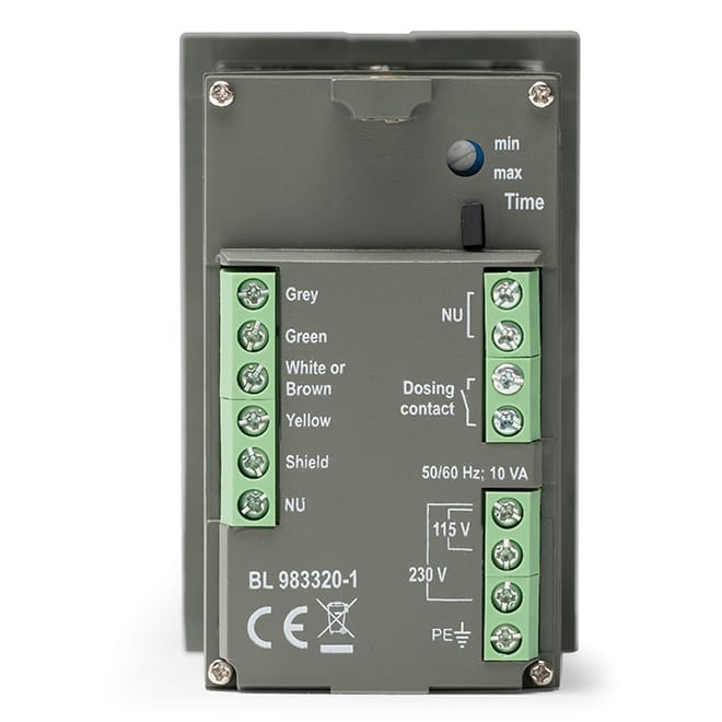 La protezione programmabile da sovradosaggio disattiva il relè se il setpoint non viene raggiunto entro un intervallo regolabile (5-30 minuti). Un LED multicolore segnala lo stato operativo: