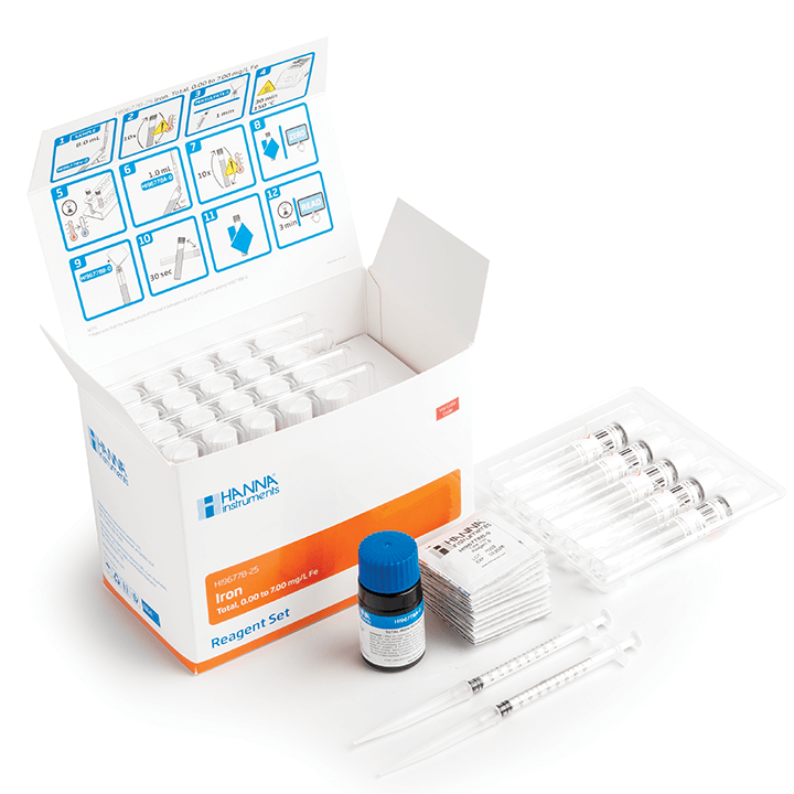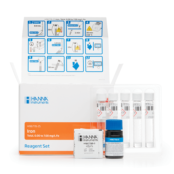 HI96778-25 sono reagenti per la determinazione colorimetrica del ferro totale. Ci sono reagenti per 25 test da utilizzare uno spettrofotometro. Questi reagenti di alta qualità sono prodotti nella nostra struttura all'avanguardia e sono contrassegnati su ogni confezione con il numero di lotto e la data di scadenza.