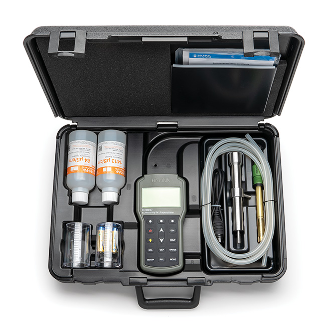 HI98197 è un misuratore portatile e robusto di EC/TDS/Resistività/Salinità con prestazioni e caratteristiche di uno strumento da banco. Questo strumento professionale a tenuta stagna è conforme agli standard IP67. HI98192 è fornito con una valigetta rigida per il trasporto, completo di tutti gli accessori per eseguire misure di Conducibilità/TDS/Resistività/Salinità e temperatura in acqua ultrapura. Gli accessori includono una cella di flusso in acciaio inox e una sonda di conducibilità a quattro anelli con elevata risoluzione di 0.001 μS/cm per la conducibilità e 0.1 MΩ * cm per misure di resistività.