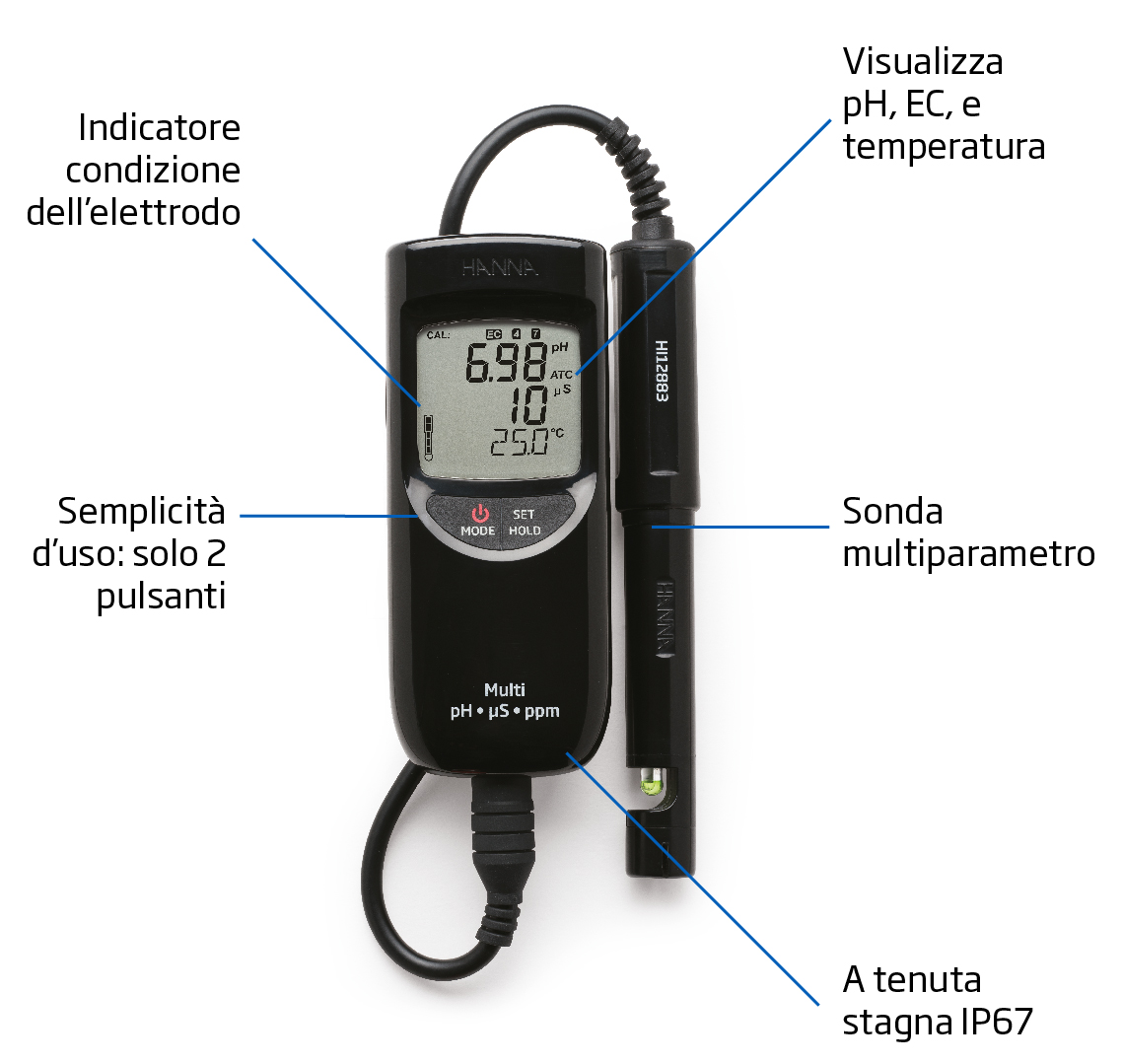 Informazioni Ordine: HI991300 è fornito con sonda HI12883, batterie, valigetta rigida e manuale di istruzioni.