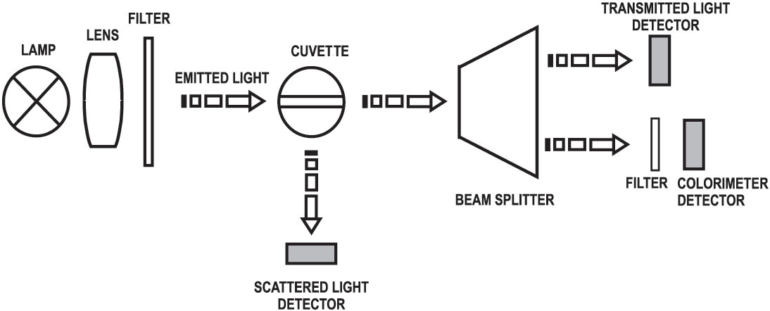 Il fascio di luce che passa attraverso il campione si disperde in tutte le direzioni. L'intensità e il percorso della luce dispersa è influenzata da molte variabili, come la lunghezza d'onda della luce incidente, la dimensione e la forma delle particelle, l'indice di rifrazione e il colore. Il sistema ottico di HI93414 comprende una lampada al tungsteno, un rilevatore di luce dispersa (90°) e un rilevatore di luce trasmessa (180°).