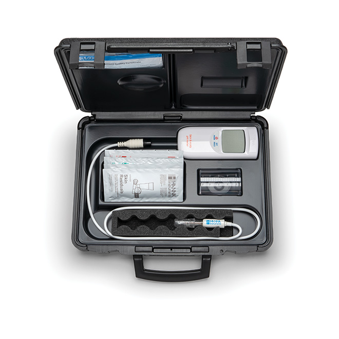 HI99181 è uno strumento portatile che misura pH/temperatura progettato appositamente per analisi sulla pelle. È possibile effettuare la calibrazione automatica a uno o due punti con due set di soluzioni standard disponibili. Tutte le calibrazioni e le misure sono compensate automaticamente per le variazioni di temperatura.