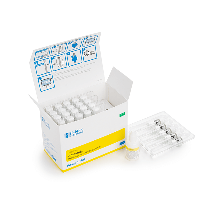 Il kit di reagenti HI93764B-25 contiene 25 fiale pronte all'uso di HI93764B-0 e 1 bottiglia di reagente Nessler HI93764-0. Questi reagenti di qualità seguono un adattamento del metodo di Nessler D1426-92, da "ASTM Manual of Water and Environmental Technology". Utilizzando questo metodo, la reazione tra l'ammoniaca e i reagenti provoca una colorazione gialla nel campione. La quantità di ammoniaca viene poi misurata colorimetricamente. L'intensità del colore è determinata da un fotometro compatibile e la concentrazione è visualizzata in mg/L (ppm) di azoto ammoniacale.