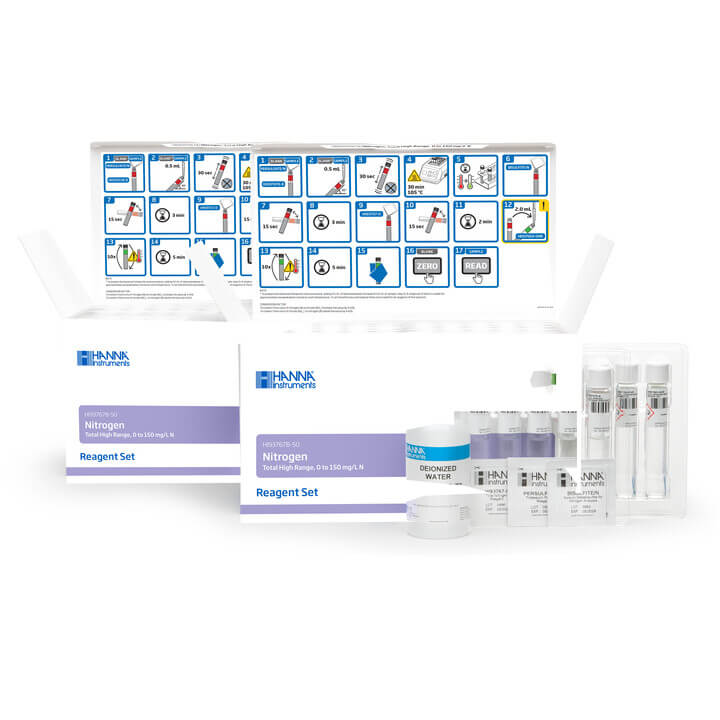 HI93767B-50 sono reagenti di qualità predosati, che consento all'utente di ottenere misure colorimetriche veloci e precise. Questi reagenti seguono un adattamento del metodo dell'acido cromotropico nel quale è richiesta una digestione per convertire tutte le forme di azoto in nitrati. Viene aggiunto metabisolfito di sodio per eliminare possibili interferenze. La reazione tra nitrati e reagenti provoca una colorazione gialla nel campione. L’intensità del colore è determinata da un fotometro compatibile e la concentrazione sarà visualizzata in mg/L (ppm) come azoto totale. Questi reagenti sono progettati per essere utilizzati con campioni che hanno un valore di azoto atteso compreso tra 10 e 150 mg/L (ppm).