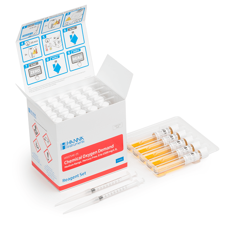 EPA - I reagenti HI93754A-25 e HI93754B-25 seguono il metodo EPA 410.4 per la determinazione del COD, che richiede l’utilizzo di solfato mercurico (HgSO4). Il solfato mercurico è presente nelle fiale di reagente EPA per attenuare l’interferenza del cloro nel campione di misura. Questo è un requisito comune a molti impianti di depurazione e impianti di produzione alimentare, che tendono ad avere alte concentrazioni di cloruri presente nei loro effluenti.