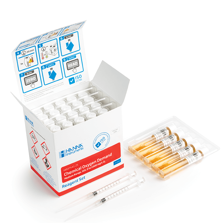 HI93754G-25 sono reagenti in fiala che seguono il metodo ISO per la determinazione di COD (Chemical Oxygen Demand) scala media, utilizzando un fotometro da banco compatibile. Ogni scatola di reagenti ha un numero di lotto e una data di scadenza per la tracciabilità.