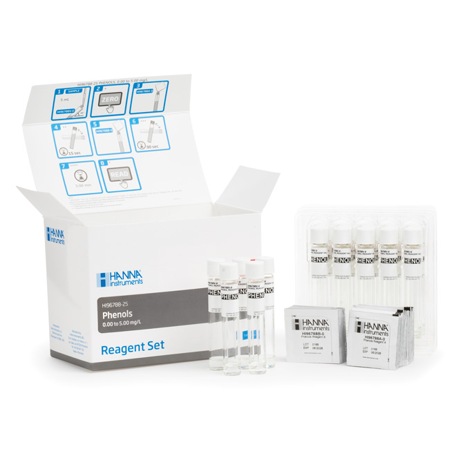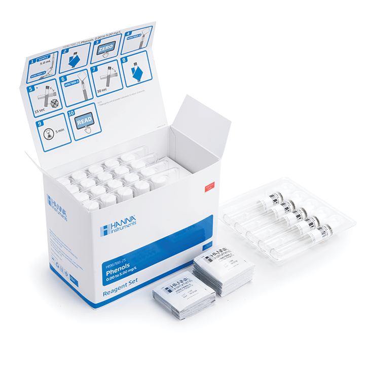 HI96788-25 sono reagenti predosati in fiala, per la determinazione colorimetrica di fenoli. La confezione contiene 25 fiale per effettuare altrettante analisi, utilizzando lo spettrofotometro o fotometri da banco di HANNA. Questi reagenti di alta qualità rispettano il metodo normato 4-aminoantipyrine: APAT 5070 (dopo distillazione) e ISO 6439:1990 (dopo distillazione) e EPA 420.1