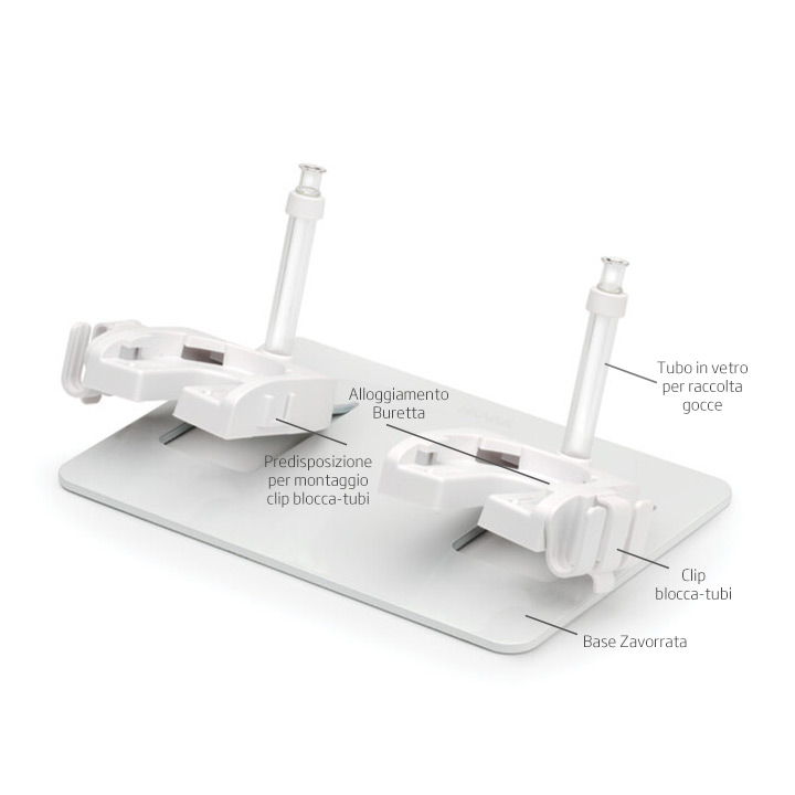 HI930160 è fornito con base zavorrata, 2 tubi in plastica con cappuccio, 2 tubi in vetro per raccolta gocce, 2 clip per il bloccaggio dei tubi delle burette e guida rapida di riferimento.
