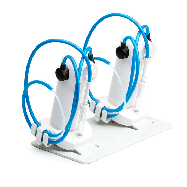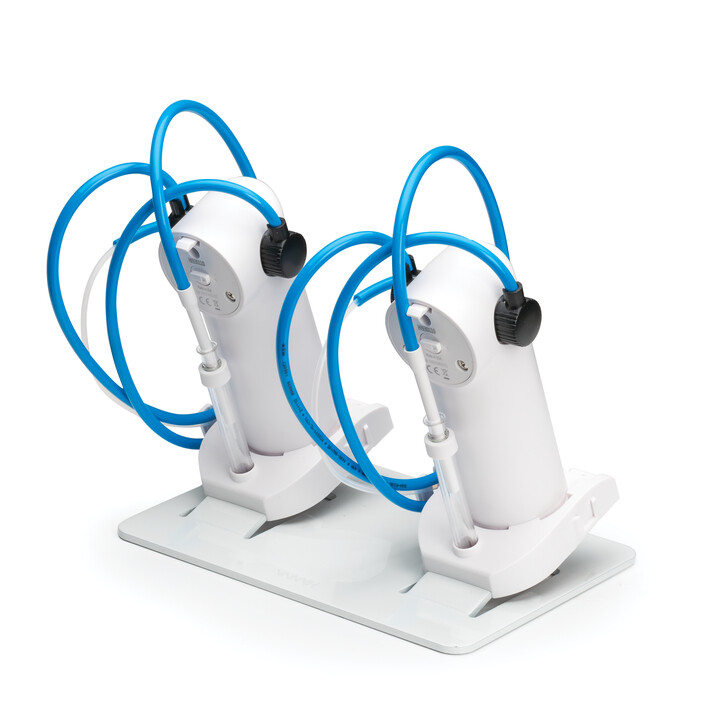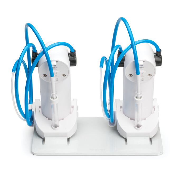 HI930160 può ospitare fino a due burette per titolatori ed è dotato di tubi in vetro per la raccolta delle gocce che fuoriescono dalle burette e di due clip per il bloccaggio dei tubi delle burette.