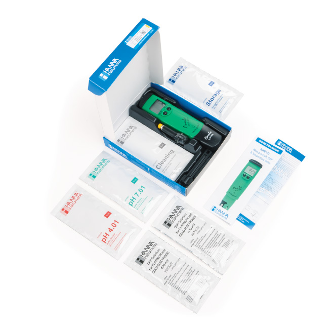 Informazioni Ordine: HI98121 (ORP/pH) è fornito con elettrodo pH HI73127, strumento per rimozione elettrodo HI73128, batterie e manuale di istruzioni.
