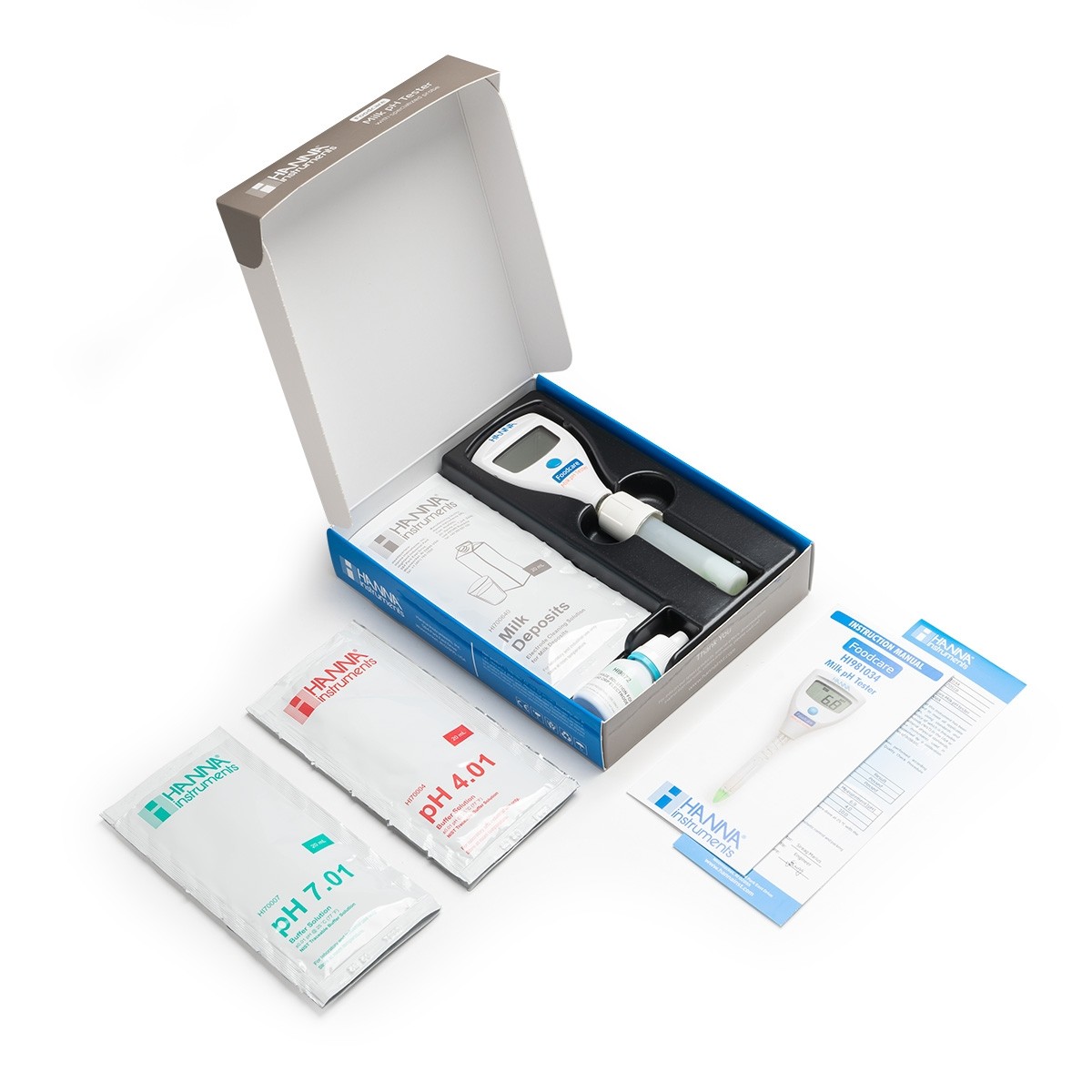 Informazioni ordine: HI981034 viene fornito con elettrodo pH per latte integrato, due bustine di soluzione tampone pH 4,01 HI70004, due bustine di soluzione tampone pH 7,01 HI70007, due bustine di soluzione detergente per elettrodo da depositi di latte HI700640, soluzione di conservazione HI9072 (13 ml), manuale di istruzioni, certificato di qualità dello strumento e custodia in plastica.
